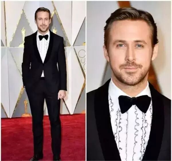 斬獲7項大獎的《愛樂之城》男主Ryan Gosling選擇較為年輕化的黑色鑲鍛晚禮服套裝,黑色絲絨領結,線條流暢的西裝完美地襯出其身形。整體LOOK雖簡約,卻在襯衫上藏了壹點“小心機”,黑色荷葉邊襯衫將整體的黑白配加入了壹點“玩世不恭”的小俏皮。