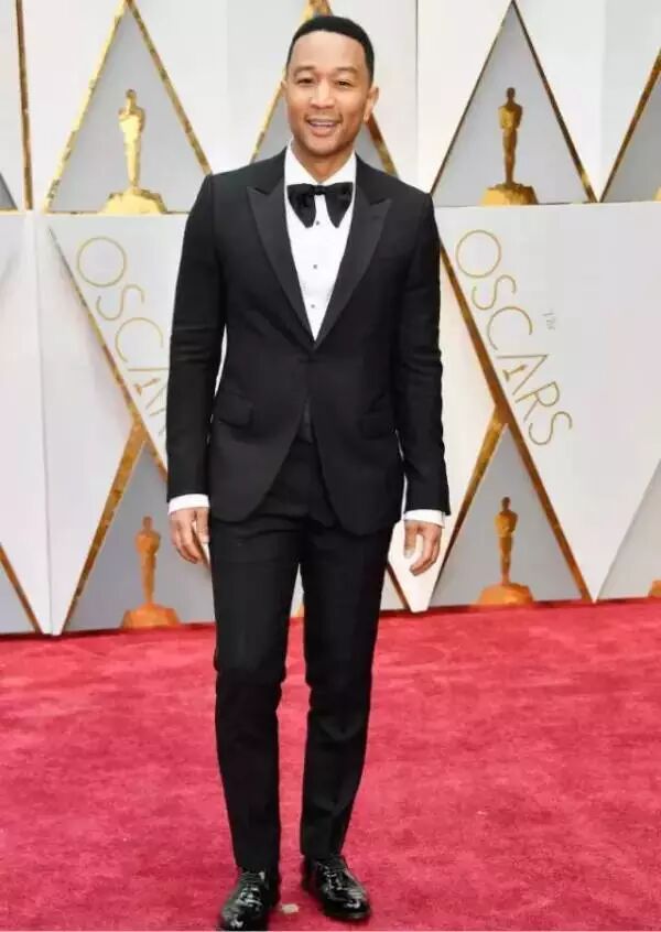 長相和身材都更接近亞洲人的 John Legend 身穿黑色單粒扣晚宴西服、剛好露出袖口三厘米的白色晚宴襯衫、黑色緞面領結、和剪裁修身,長度剛好可以露出黑色亮面綁帶皮鞋的褲子。每個細節都規規矩矩、恰到好處。