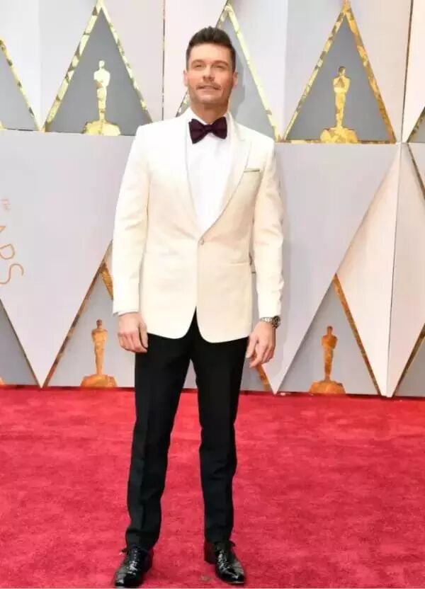 Ryan Seacrest 則以緞面深紅色領結為白色禮服增添跳躍的朝氣,時尚度直線UP。
